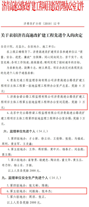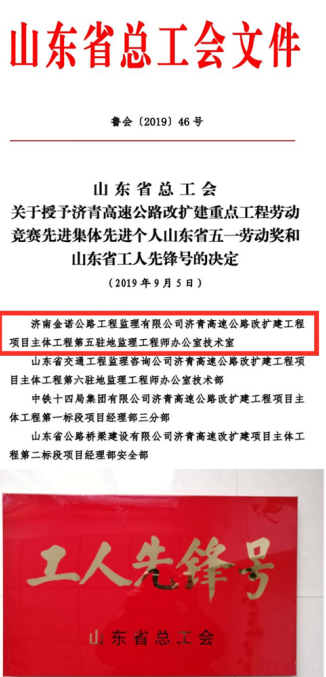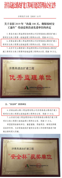 近日,由濟南城市建設集團所屬濟南金諾公路工程監理有限公司承建的濟青高速第五駐地辦榮獲2019年山東省總工會“工人先鋒號”榮譽稱號, 同時,在2019年度該項目“決戰100天,確保按時交工通車”勞動競賽活動中表現突出,榮獲2019年濟青高速改擴建工程“優秀監理單位”、“安全杯”獲獎單位榮譽稱號;其中,項目負責人獲得“優秀駐地監理工程師”稱號, 6位同志獲得“監理單位先進個人”稱號, 2位同志獲得“監理單位安全生產先進個人” 稱號,共獲得專項獎勵49.6萬元。