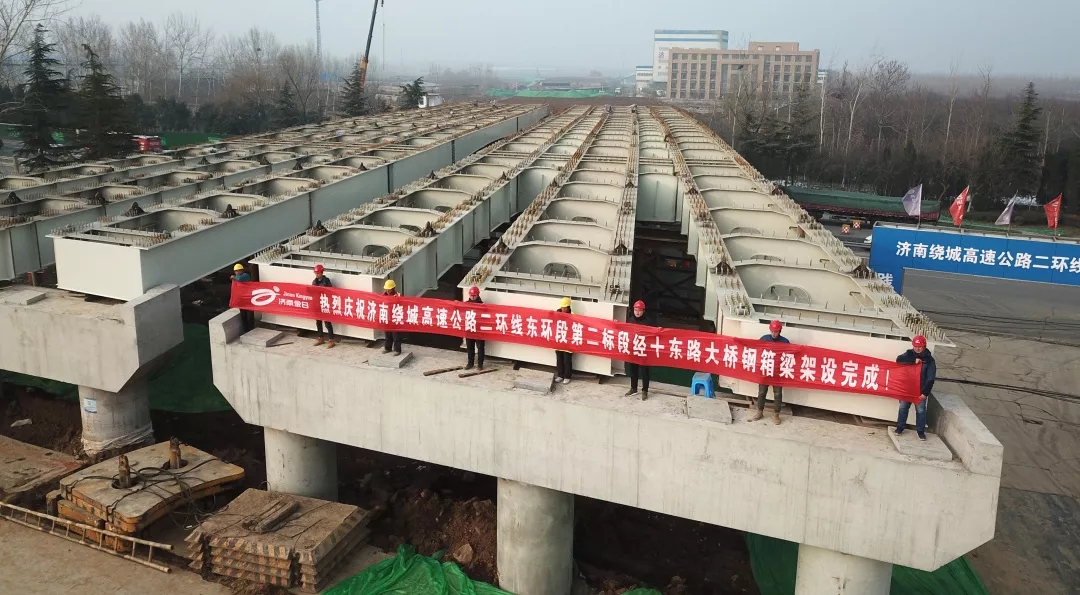 1月18日,濟南繞城高速公路二環線東環段二標段(濟南“大東環”)互通主線橋跨經十路鋼箱梁順利合攏。至此,項目跨越經十東路大橋鋼箱梁架設工作全部完成,為實現年底通車的目標打下了良好基礎。
