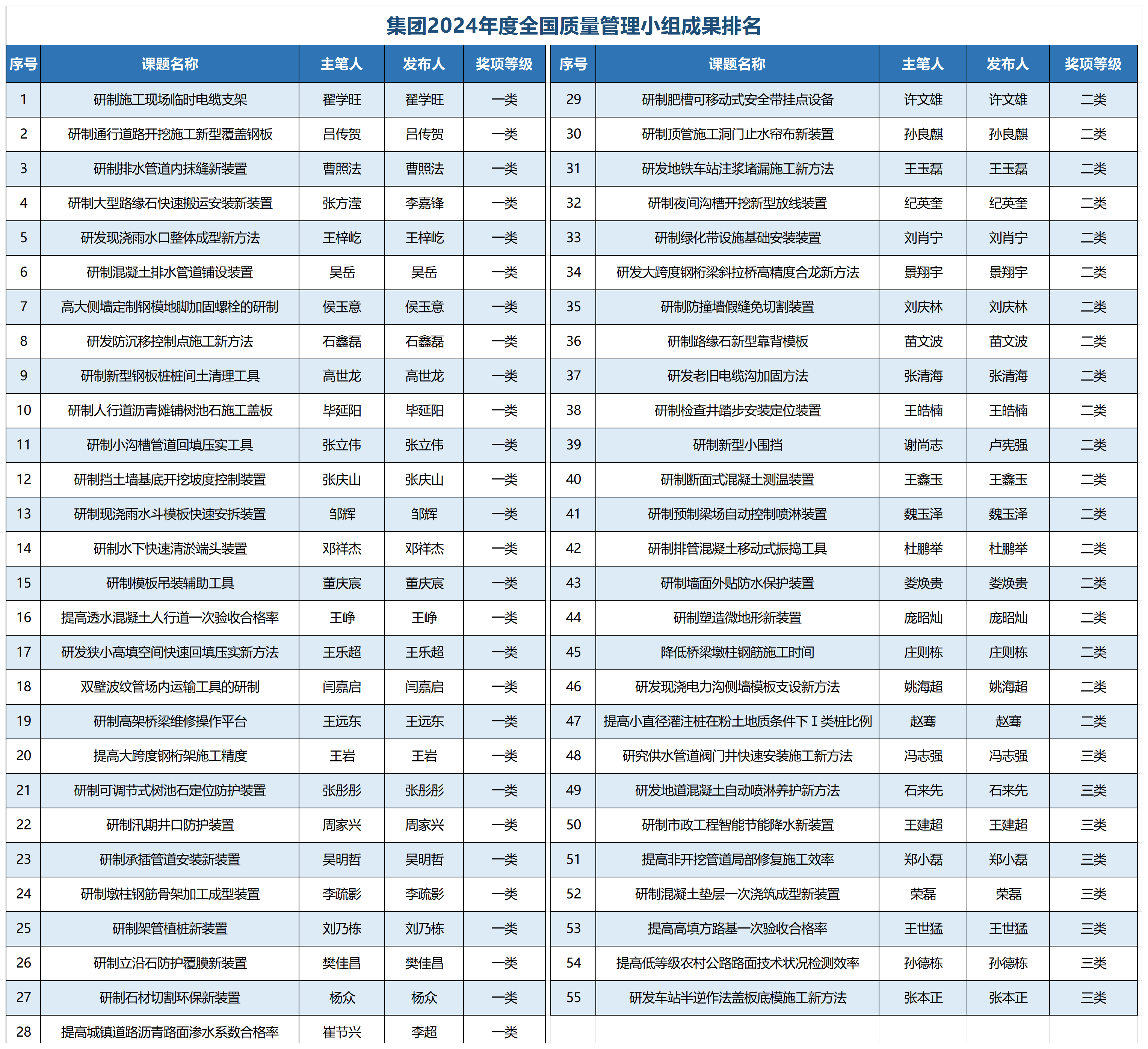在本次市政工程建設(shè)質(zhì)量管理活動中,城建集團公司發(fā)布QC成果55項,其中,一類成果28項、二類成果19項、三類成果8項;發(fā)布質(zhì)量信得過班組成果14項,其中,示范級班組8項、專業(yè)級班組5項、推進級班組1項。